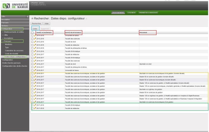 Pour définir une ou plusieurs dates d’ouverture du configurateur, il faut utiliser la fonctionnalité « créer » et indiquer au minimum, l’année académique, l’entité responsable ainsi qu’une date de début et une date de fin.